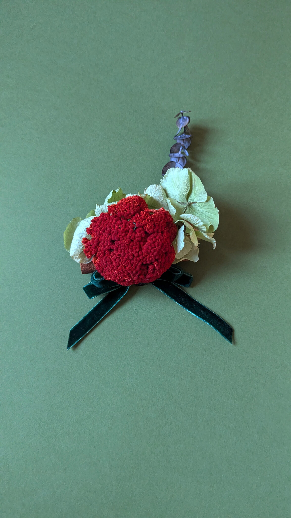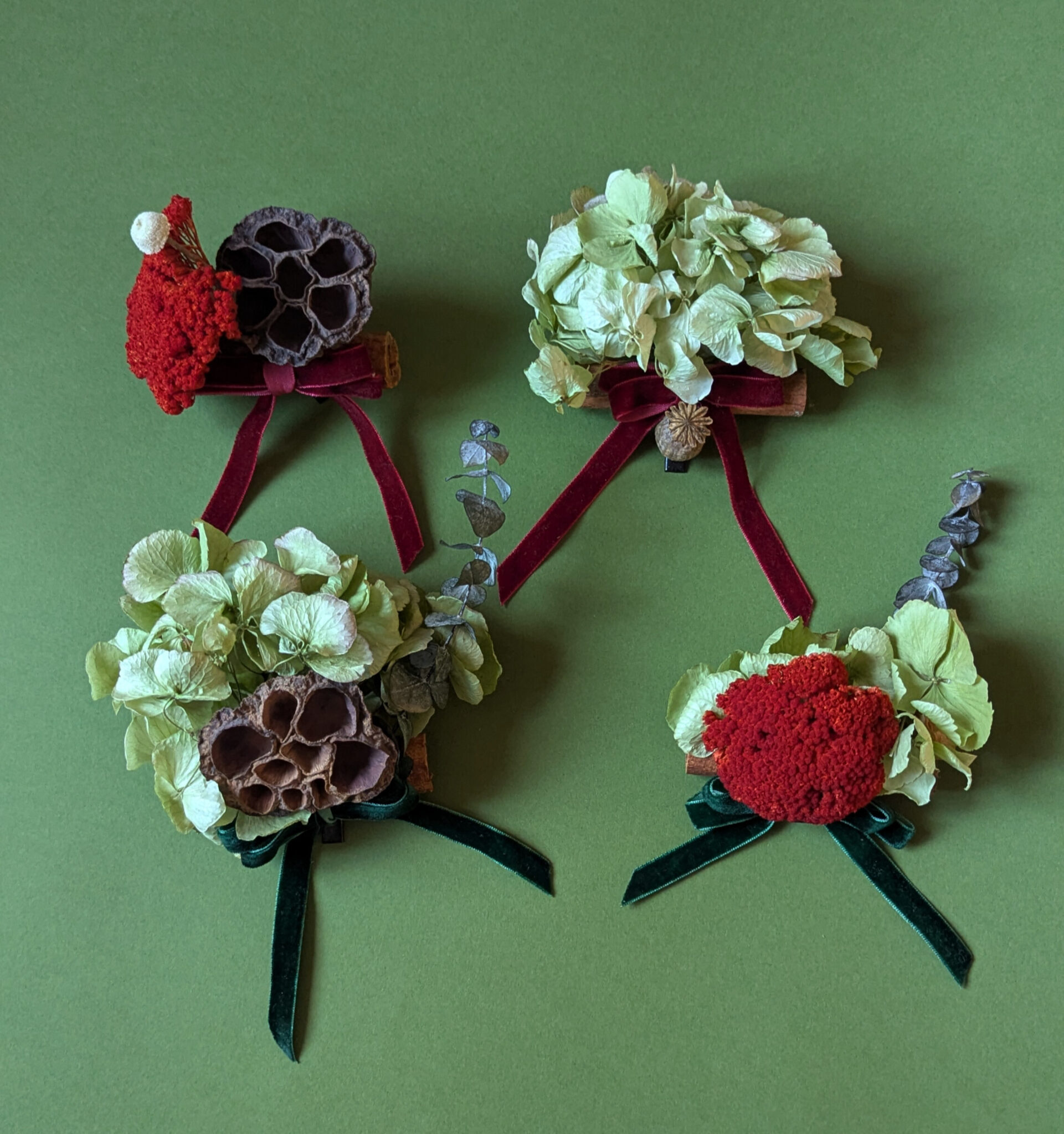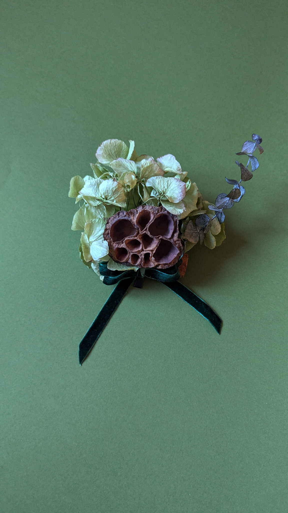 Dried hydrangea · lotus pods · preserved red yarrow · eucalyptus sprigs · poppy seed heads · cinnamon sticks · eriocaulon decangulare · velvet ribbon