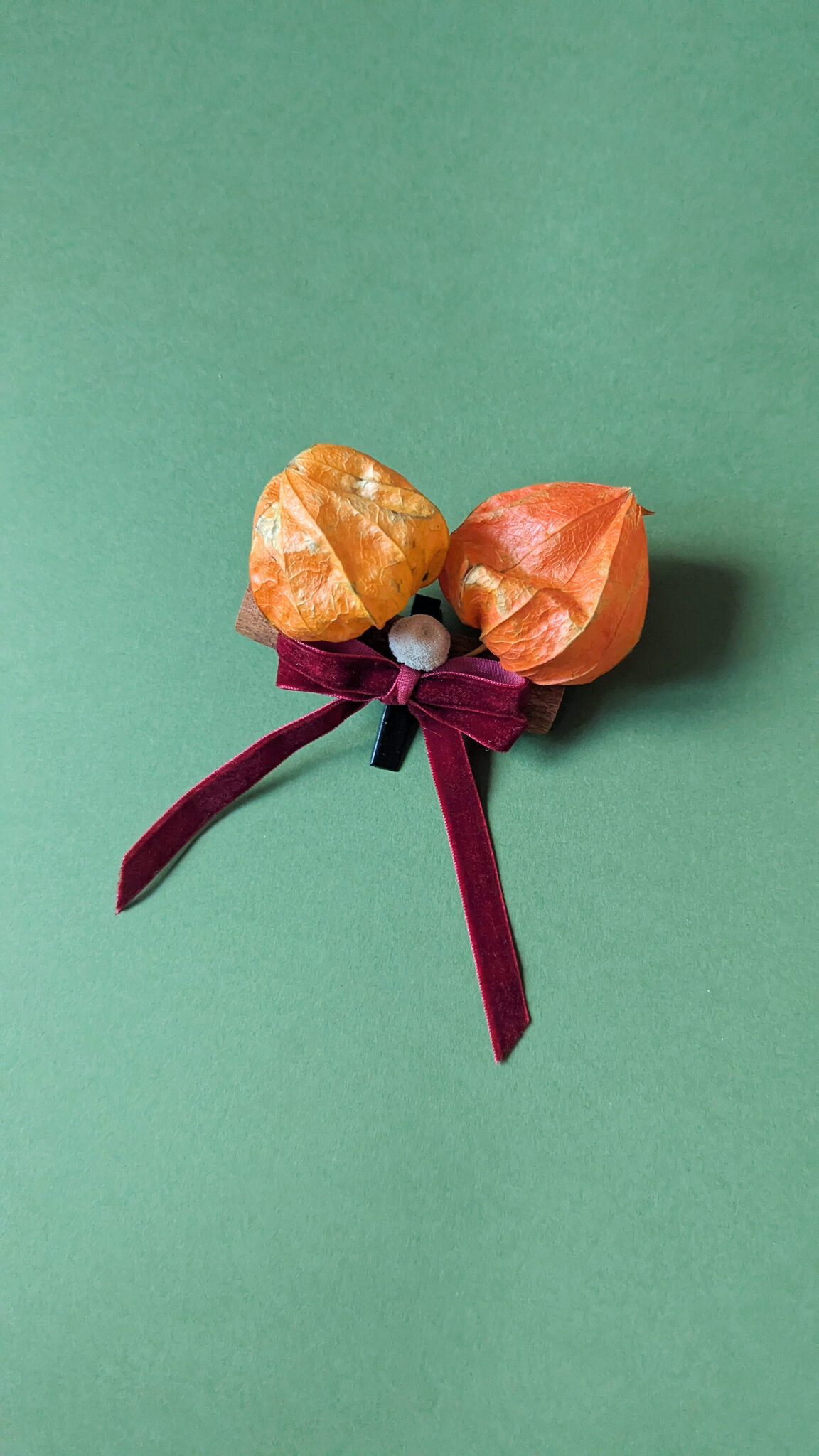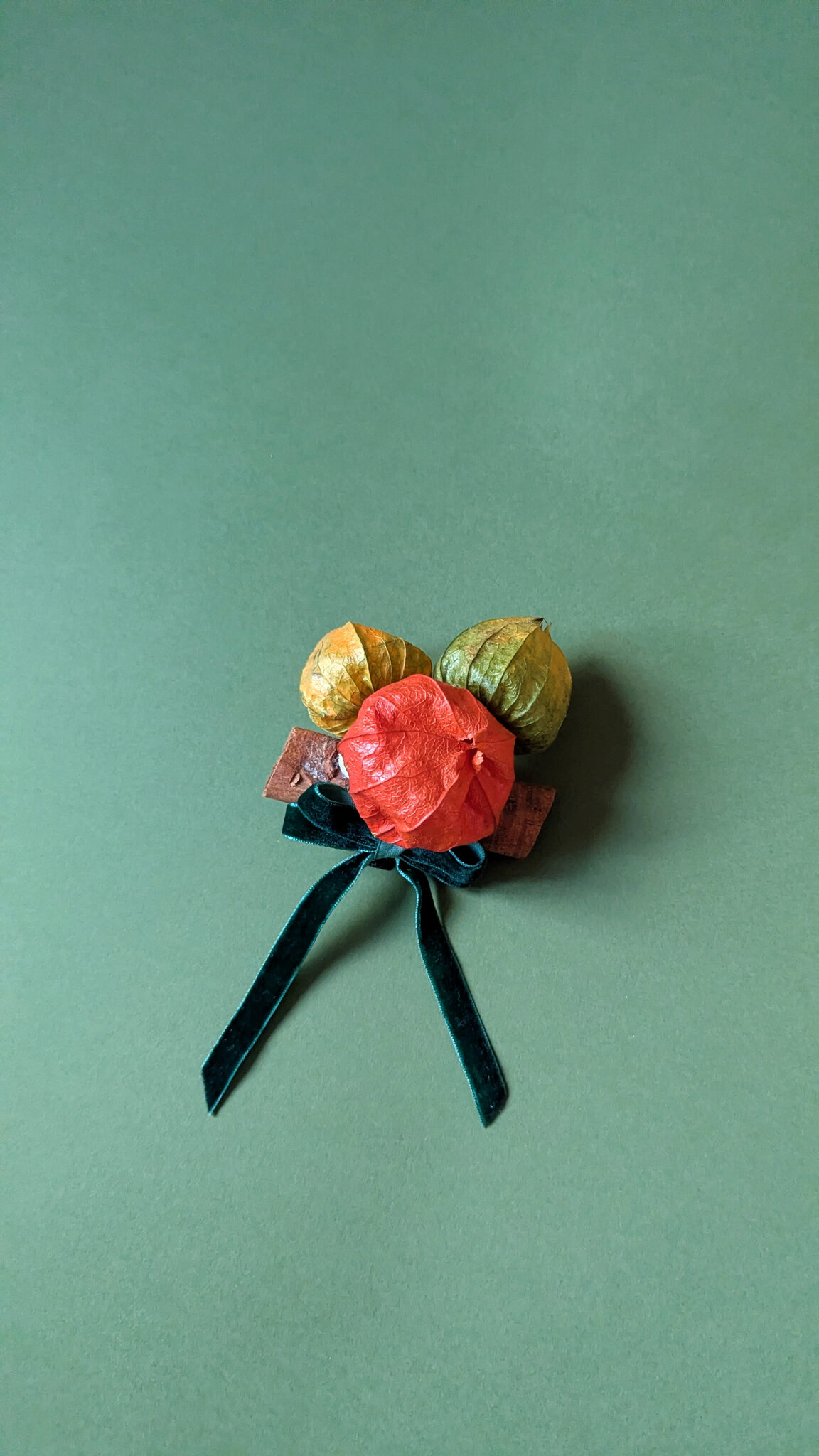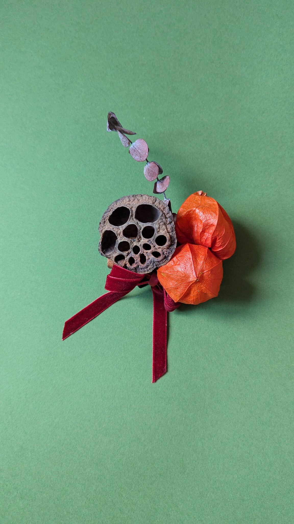 Physalis lanterns · dried lotus pods · preserved eucalyptus · dried eriocaulon decangulare · poppy seed heads · cinnamon sticks · velvet ribbon