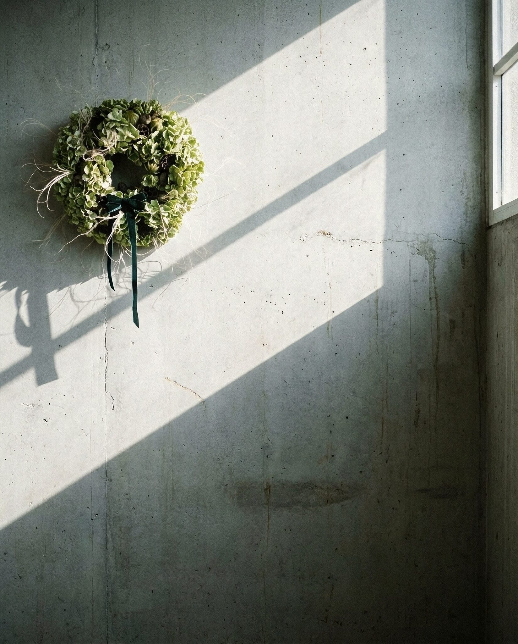 A mossy, woodland-inspired wreath rich in soft green hydrangea and sculptural seedpods, finished with fine wisps of natural texture that feel almost wind-carried. Earthy browns anchor the palette, while the deep velvet bow adds a quiet, luxurious contrast. The overall mood is calm, textural and organic - a modern take on winter botanicals with a subtle forest mystique.