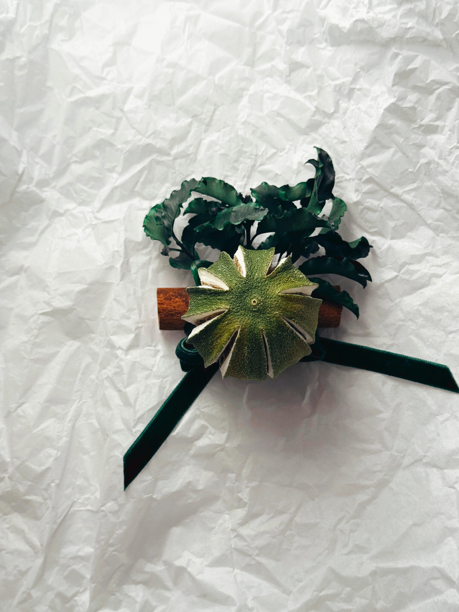 Dried green orange · preserved pittosporum · cinnamon sticks · velvet ribbon