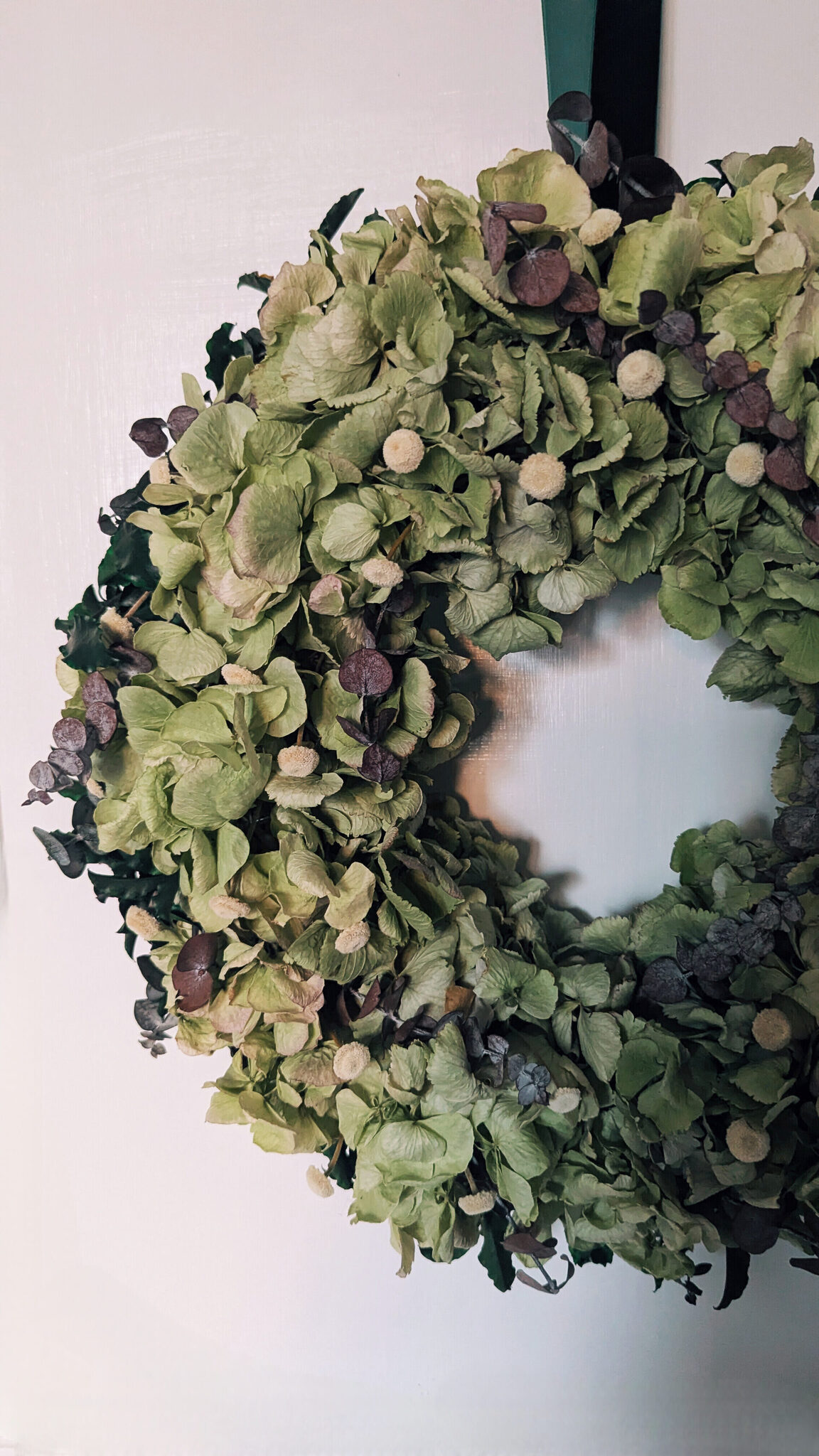 I handled hydrangeas by declustering every small branch onto a natural base to keep the structure light yet full. Most of the hydrangea was dried from my summer harvest, giving the piece its soft, varied greens. It came together over one evening, allowing the colour transitions to feel organic and balanced complimented by an emerald green pittosporum ring around it.